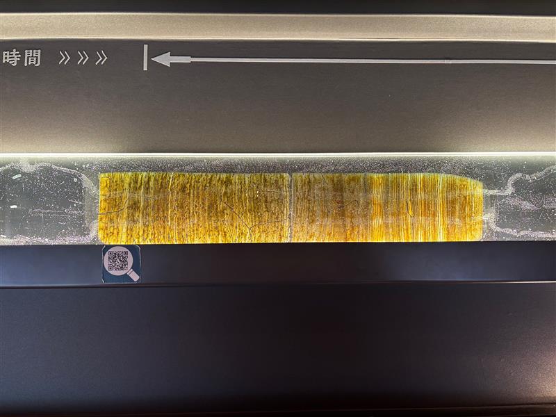 2025年の水月湖ボーリング調査で採取した一番新しい年縞がステンドグラスに加工され、水月湖年縞7万年ギャラリーに入りました。