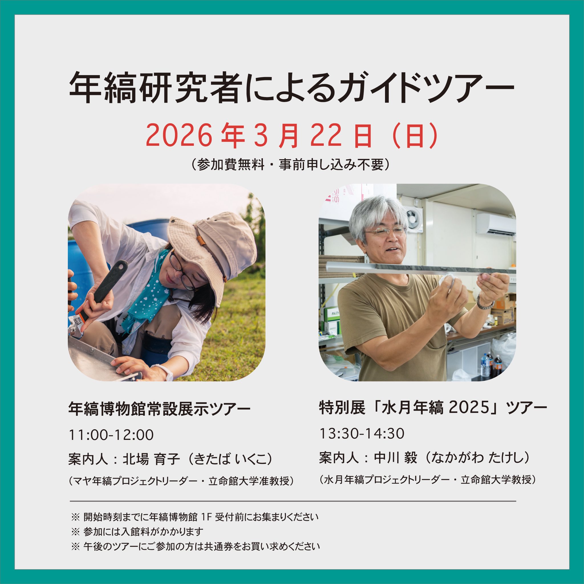 案内人はマヤ年縞のリーダー・北場育子さんと、水月プロジェクトのリーダー・中川毅さんが務めます。 参加をご希望の方は年縞博物館にお集まりください!